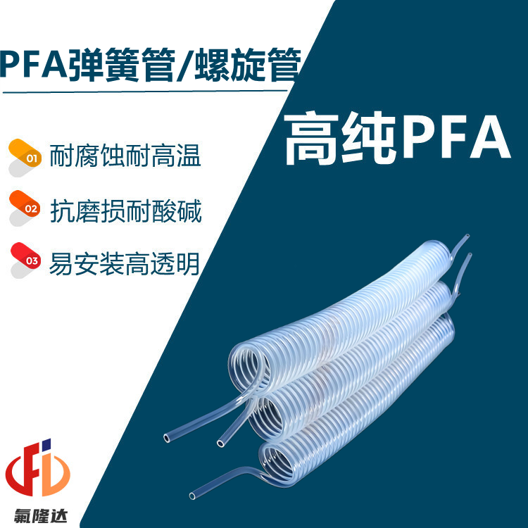 PFA弹簧管是一种高性能的管道产品,其全称是Polyfluoroalkoxy(过氟烷基化物),中文名称叫做可溶性聚四氟乙烯。它是由少量全氟丙基全氟乙烯基醚与聚四氟乙烯的共聚物制成,并经过氟化处理,从而在保持聚四氟乙烯的优异特性的基础上,进一步提升了耐化学性、耐热性和机械强度。以下是对PFA弹簧管的详细解析: