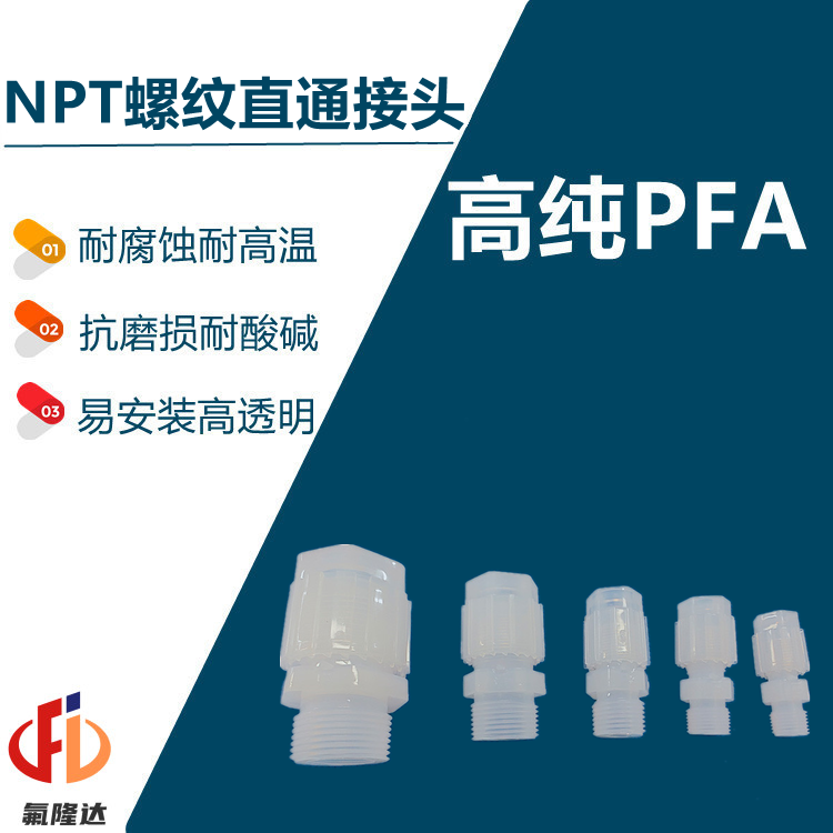 2、耐高温性能:PFA氟制品NPT外丝螺纹直通接头能够在高温环境下保持稳定的性能,不会因温度变化而发生变形或失效,适用于高温流体传输。