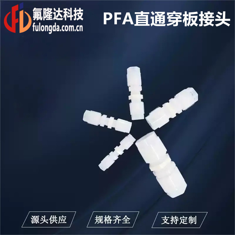 PFA直通穿板接头是一种特殊的氟塑料管件,主要用于连接PFA管道或设备,特别是在需要耐化学腐蚀、高温或高压的环境中。以下是对PFA直通穿板接头的详细解析: